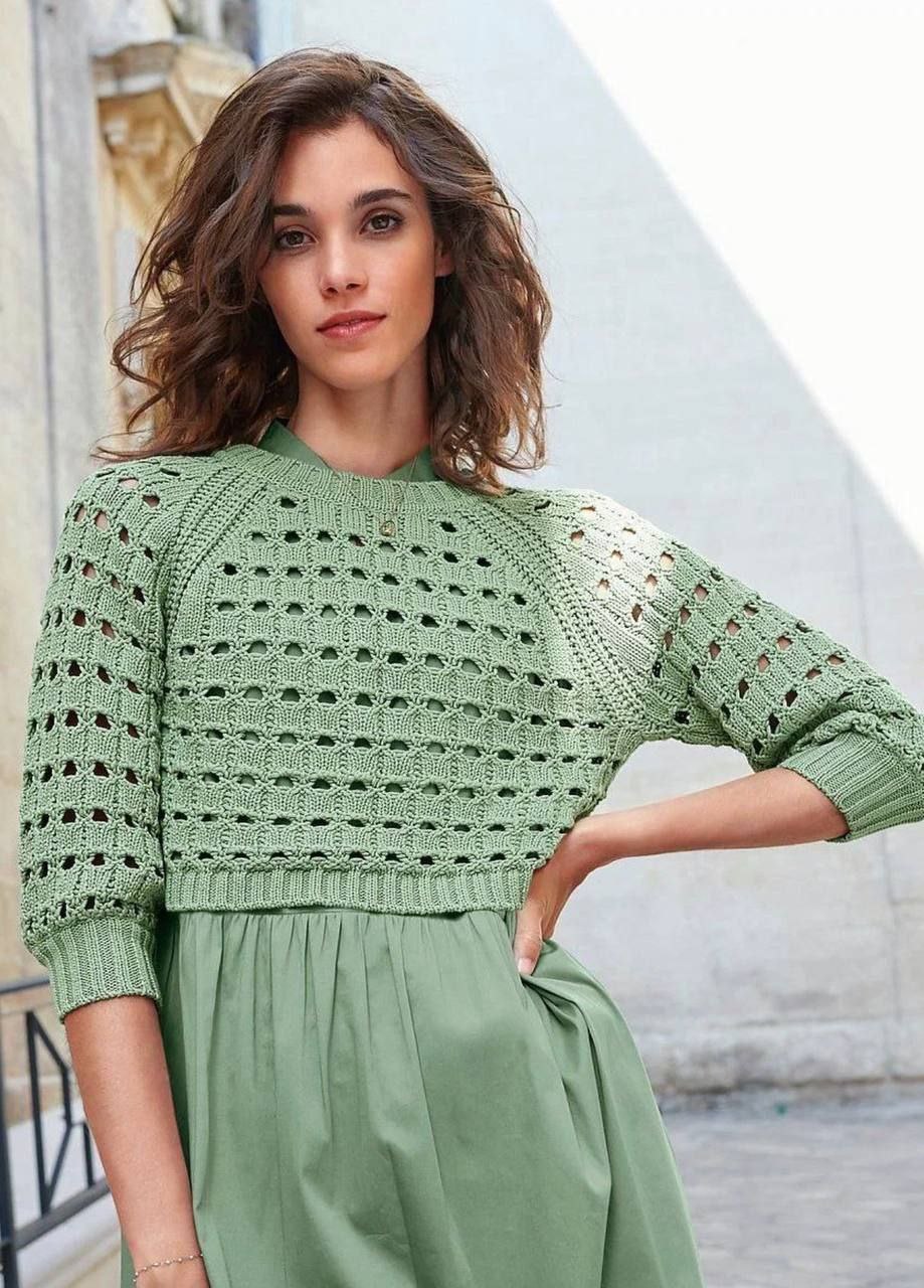 Кофты и пуловеры Яркое тепло и уют — вязаный топ с изысканными ажурными вставками и тонкой отделкой по краям, создающий неповторимый стиль и комфорт. 01.10.2025 0