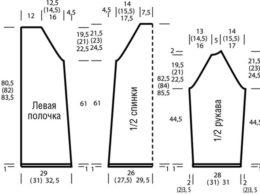 Через 61 см = 180 рядов от планки закрыть для регланного скоса с обеих сторон 1 x 1 (3) 5 п., затем в каждом 2-м ряду 28 (30) 32 x 1 п.