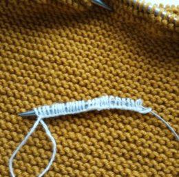 Далее потребуется дополнительная спица и нить. Набираем 30 петель(см. карусель). Затем с дополнительной спицы провязываем 30 петель для рукавов. Затем нужно скинуть 3 петли на подрезы и завязать, чтобы не “убежали”.