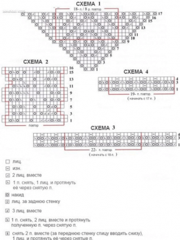 След. круг. р.: [10-й р. по схеме 1 (18 п. раппорта повторить дважды), 2-й р. по схеме 2] вязать дважды (все что в квадратных скобках) = 188 п. Продолжить работу по схеме 1 до 17-го ряда и по схеме 2 до 9-го ряда = 220 п. Затем вязать с 10-го по 17-й р. по схеме 1, повторив еще раз 18 п. раппорта в 8-ми рядах, одновременно вязать по схеме 2 до 16-го ряда (всего 8 раз) и закончить в 16 ряду по обеим схемам = 680 п. в ряду: по 53 п. центральных частей и по 287 п. боковых сторон. Переходите на более длинные спицы, когда число петель увеличивается.
