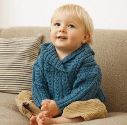 На детском пуловере вертикально расположенные косы разграничиваются чёткими выпуклыми полосами, а ворот с капюшоном выполнен крупной резинкой. Плечики спущены, как у большого, рукавчик полной длины.