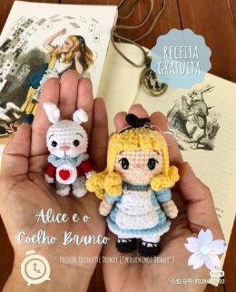 Изящная корзинка на платье куклы намекает на внимание к деталям. Вязаная Алиса с ее блондинистыми косами и очаровательный Белый Кролик создают сказочную пару, идеально воплощающую волшебство ручной работы.