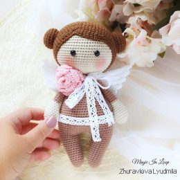 Помните, как в детстве куклы оживали в наших мечтах? Этот милый ангелочек из пряжи словно вышел из тех фантазий. Очаровательные кудряшки и розовая роза на груди придают ему особое очарование. Кружевные крылышки добавляют нежности и изящества, делая его идеальным спутником для уютных вечеров.