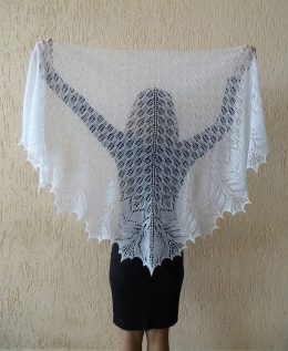 Спицами выполнена из тончайшей пряжи, создающей воздушную и легкую текстуру, а уникальный узор с листьями и волнистыми краями придает изделию изысканность и изящество. Центральная линия симметрично делит шаль на две части, подчеркивая мастерство вязания и сложность узора.