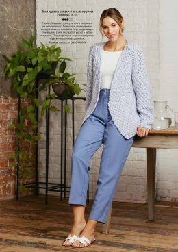 Изысканный узор из сквозных дорожек и мерсеризованная хлопковая пряжа придают пуловеру изумительный глянцевый оттенок, создавая весеннее настроение. Особенностью модели являются объемные рукава реглан и широкий вырез горловины, отделанный резинкой, что делает изделие стильным и комфортным.