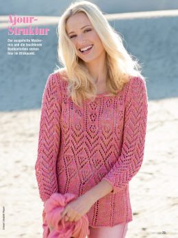 Особое внимание уделено сложной структуре вязки, которая сочетает в себе геометрические и цветочные мотивы, придавая изделию легкость и воздушность. Использование насыщенных, сочных оттенков придает пуловеру свежесть и современность, идеально подходящую для весенне-летнего сезона.