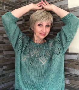 Свободный свитер с короткими рукавами украшен красно-синим орнаментом в стиле фольклорных мотивов на светлом фоне. Особенность модели — контрастные полосатые ма...
