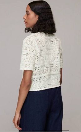 Этот белый топ с короткими рукавами напоминает о летних прогулках в парке, когда легкий ветерок играл с ажурными узорами на ткани. Уникальные детали — сложная вязка с чередованием геометрических мотивов и аккуратные края с мелкой каймой, которые придают изделию изысканный и воздушный вид. Такой топ отлично подойдет для создания утонченного образа в теплое время года.