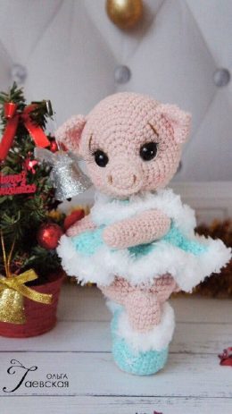 Этот очаровательный вязаный поросенок, словно сошедший с балетной сцены, покоряет своим изяществом и милым взглядом. Нарядная голубая юбочка и белоснежная опушка придают ему особый шарм, а аккуратные пуанты завершат образ настоящей балерины.