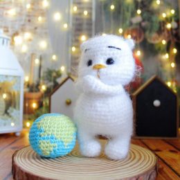 Вдохновляйтесь этим милым вязаным медвежонком, который бережно обнимает свою маленькую планету. Обратите внимание на трогательные детали: аккуратные лапки и выразительные глазки этого пушистого друга.