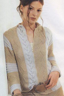 Вязание жакета: для левой полочки набрать 52 п. (30 п. серых, и 22 п. бежевых ) и связать 1 изн. р. резинкой А. Этот ряд не учитывается при дальнейшем счете. Затем вязать следующим образом: кром., 11 п. резинки В, начав с 1 лиц. и 18 п. косы серых, 21 п. узора с ромбами и кром. бежевых. Каждый цветной участок вязать от отдельного клубка и при смене цвета перекрещивать нити по изнаночной стороне работы, чтобы не возникало отверстий. Через 32,5 см = 88 р. от наборного края прибавить для рукава с правой стороны 1 п. и включить ее как лиц. п. в резинку В. Затем дополнительно набрать в каждом 2-м р. 14 х 5 и 1 х 4 п. и вязать прибавленные петли следующим образом: первые 21 п. бежевых вязать узором с ромбами, следующие 18 п. серых-резинкой В, при этом начать и закончить 2 лиц., следующие 21 п. бежевых вязать узором с ромбами, оставшиеся