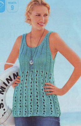 Спинка/перед: меланжевой нитью набрать 72 (79) п. и связать 1 изн. р. изн. (этот ряд не учитывается при дальнейшем счёте). Затем вязать ажурным узором. Через 24,5 см от наборного края для придания формы между дорожками ажурного узора в 1-й, 3-й, 5-й, 7-й и 9-й дорожках из изн. глади провязать по 2 п. вместе изн. = 67 (74) п. Такие убавления повторить через 29 см от наборного края в остальных дорожках из изн. п. = 63 (69) п. Через 32 (33,5) см от наборного края вязать резинкой двойной бирюзовой нитью. Через 41 (42,5) см от наборного края закрыть для пройм с обеих сторон 2 п., затем в каждом 2-м р. 6 х 1 п.. выполняя убавление 1 п. = 47 (53) п. Через 48 (50,5) см от наборного края закрыть для выреза горловины средние 13 (19) п. и обе стороны закончить раздельно. Для закругления закрыть с внутреннего края в каждом 2-м р. 6 х 1 п., выполняя убавление 1 п. Через 59 (61,5) см от наборного края оставшиеся 11 п. закрыть.