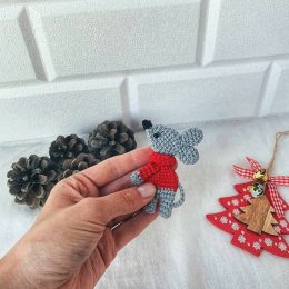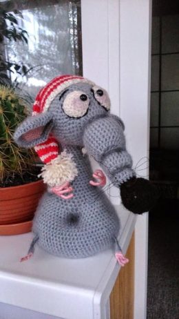 Это очаровательная вязаная крыса в сером цвете, с длинным носом и большими ушами. На ней яркая полосатая шапочка с помпоном, добавляющая зимнее настроение. Идеа...