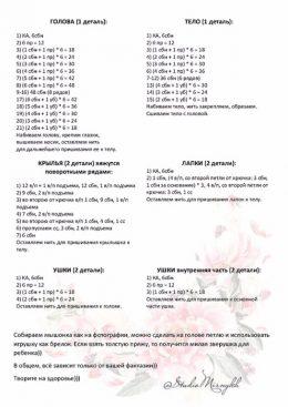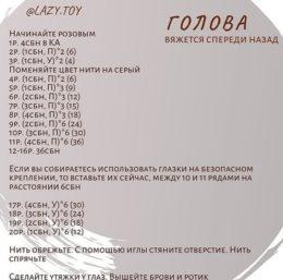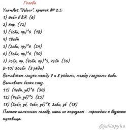 Голова 1 ряд:6 вп замкнуть в кольцо,6 сбн=6 сбн 2 ряд:6 приб=12сбн 3 ряд:1 сбн,1 приб х6 =18 сбн 4 ряд:2 сбн,1 приб х6 = 24сбн 5 ряд:3 сбн,1 приб х 6 = 30 сбн 6...