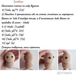 Начинаем тело с ножек. 2 сбн, из них 6 сбн 2р- по кругу 3р- 5 сбн, приб(7) 4р- 6 сбн, приб (8) 5р- 7 сбн, приб(9) 6-7р- по кругу (9) Обрезать нить. Связать втор...