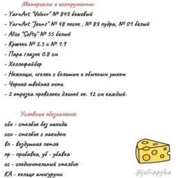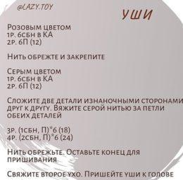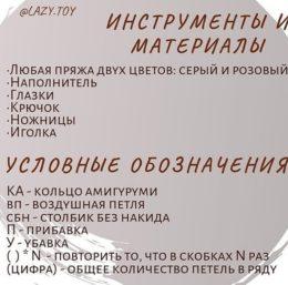 Пряжа использована белая YarnArt Barba 370 м в 100 гр. розовая для носа, лап Kartopu Sena, крючок №3. вязание начинаем от носа: 1 ряд - набираем 5 сбн в кольцо...