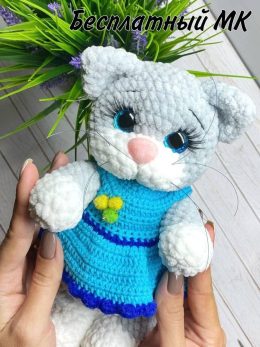Этот милый вязаный котёнок выполнен в технике амигуруми, популярной в Японии с середины XX века. Игрушка привлекает внимание своими яркими голубыми глазами и пу...