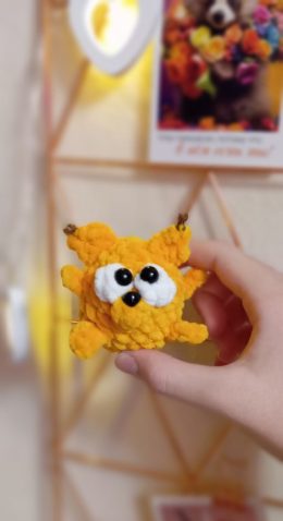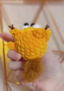 Эта вязаная игрушка отличается очаровательными маленькими ушками, которые придают ей уникальный шарм. Яркий желтый цвет и забавные глазки делают её особенно при...