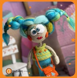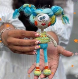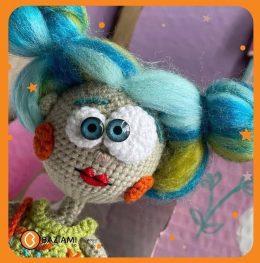 Эта очаровательная кукла амигуруми с забавными голубыми волосами и причудливым выражением лица явно знает толк в моде. В ярком топе и леггинсах она готова покор...
