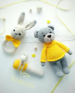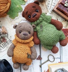 Очаровательные ручные мишки, выполненные в стиле амигуруми, одеты в уютные свитера оранжевого и зеленого цветов. Внимание привлекают маленькие детали: на одном...