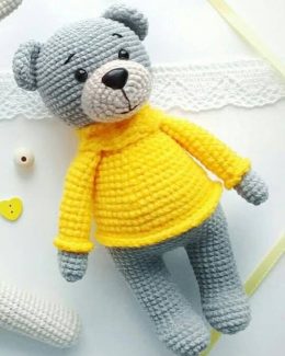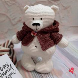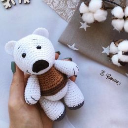 Этот очаровательный вязаный мишка покоряет с первого взгляда! Белоснежная пряжа в сочетании с мягким коричневым и серым цветами создает уютный и стильный образ....