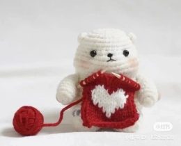 Маленькие вязаные медвежата, выполненные в технике амигуруми, держат в лапках красные вязаные квадраты с белым сердцем. Уникальная особенность — использование к...