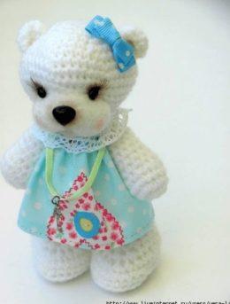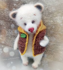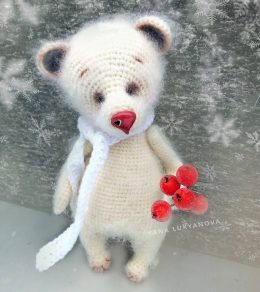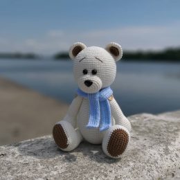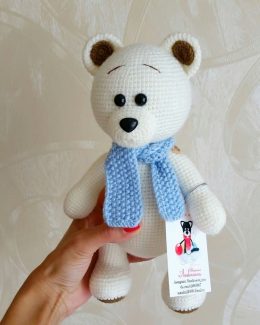 Перед вами прекрасный медвежонок, выполненный в технике амигуруми. Его мягкая белая шерсть, милый красный носик и длинный белый шарф создают идеальный зимний об...