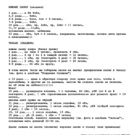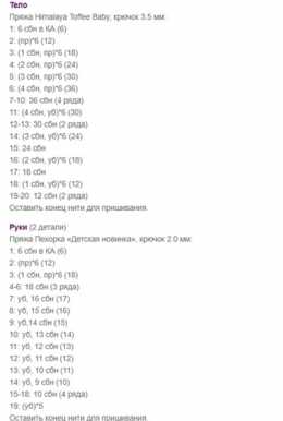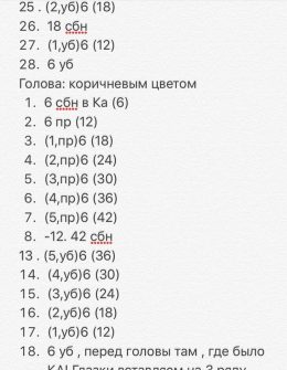 Голова 1) 6 сбн в КА 2) пр х 6 раз (12) 3) (сбн, пр)х 6 раз (18) 4) (2 сбн, пр)х 6 раз (24) 5) (3 сбн, пр)х 6 раз (30) 6) (4 сбн, пр)х 6 раз (36) 7) (5 сбн, пр)...