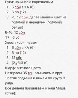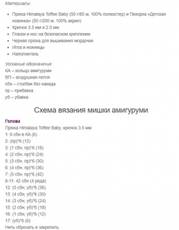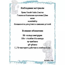 Мишка. Автор Наталья Андросова УСЛОВНЫЕ ОБОЗНАЧЕНИЯ: КА - кольцо амигуруми сбн - столбик без накида пр - прибавка, 2 сбн в одну петлю уб - убавка, 2 cбн провяза...