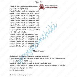 Голова 1 ряд: 6 сбн в кольцо (6) 2 ряд: Прибавка в каждую сбн (12) 3 ряд: [1 сбн, прибавка]Х6 (18) 4 ряд: [2 сбн, прибавка]Х6 (24) 5 ряд: [1 сбн, прибавка, 2 сб...
