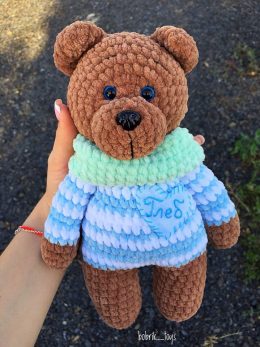 В наше время родители уже не хотят иметь дома мягких или вязанных игрушек так как считают их пылесборниками. Мне кажется от такого медвежонка не сможет отказать...
