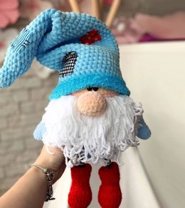 Этот забавный вязаный гномик сразу привлекает внимание своей яркой, пышной бородой и огромной голубой шапкой с разноцветными заплатками. Его красные башмачки до...