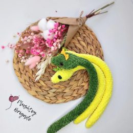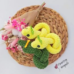 Начните с крошечного бантика на хвостике. Эти вязаные змеи — забавное сочетание ярко-желтого и зеленого цветов, а их игривые глазки с бантиками добавляют им оча...