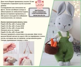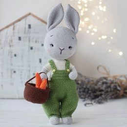 Контраст серого заяца и ярко-зеленого комбинезона сразу привлекает внимание. Особенно забавен маленький коричневый корзин, наполненный оранжевыми морковками, ко...