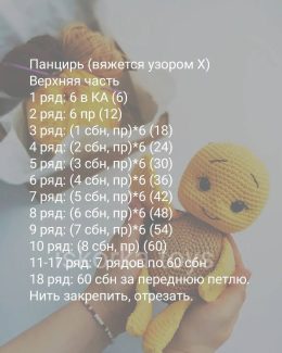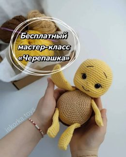 Очаровательная вязаная игрушка ручной работы, выполненная в технике амигуруми. Черепашка имеет яркий желтый цвет головы и лапок, контрастирующий с коричневым па...