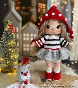 Эта очаровательная вязаная кукла с милым пёсиком — идеальное дополнение для создания атмосферного декора. В её стильной шапочке с помпонами и ярких красных боти...