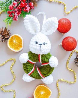 Пусть ваш дом наполнится теплом и уютом! Этот очаровательный кролик, выполненный из мягкой пряжи, держит в лапках зеленый венок с красно-белыми акцентами. Он ок...