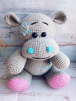 Этот очаровательный вязаный гиппопотам выполнен в уникальной технике амигуруми, которая придает ему особую мягкость и дружелюбный вид. Забавные голубые заплатки...