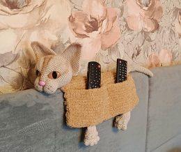 Вязаный кот контрастирует с пушистым телом. Забавные глазки и розовый нос делают его особенно милым, а кармашки для пультов добавляют функциональности. Идеи для...