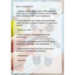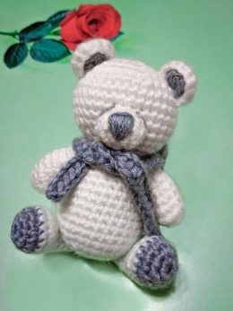 Этот очаровательный вязаный мишка, выполненный в технике амигуруми, мгновенно привлекает внимание своим уютным шарфиком и мягкими лапками. Контрастные серые акц...