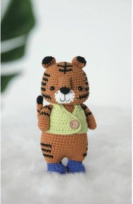 Какое очаровательное творение! Этот милый вязаный тигрёнок радует своими забавными полосками и стильным зелёным жилетом с крупной пуговицей. Яркие синие ботиноч...