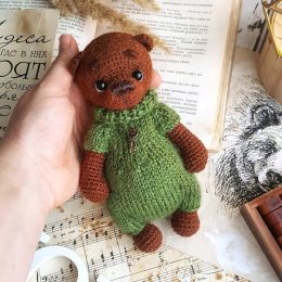 Контраст между зелёным и оранжевым нарядами этих милых вязаных медвежат сразу привлекает внимание. Мягкие плюшевые тела дополнены маленькими украшениями в виде...