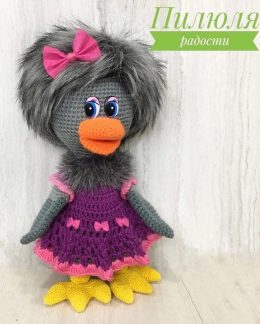 Очаровательная вязаная утка амигуруми, выполненная в нежно-желтых тонах, с ярким оранжевым клювом и лапками. Ее выразительные черные глазки придают игрушке живо...