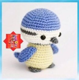 Ты отлично справился! Это милое вязаное изделие похоже на синего воробья. Особенности, которые выделяются, — это его яркая синяя шапочка и забавные черные глазк...