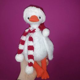 Очаровательное рукодельное изделие: этот вязаный гусь выполнен в праздничной зимней тематике. Он украшен милой шапочкой и шарфом в красно-белую полоску, добавля...