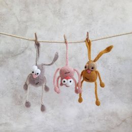 Эти очаровательные вязаные зайцы выполнены в оригинальном стиле амигуруми. Серый, розовый и коричневый зайчики отличаются милым дизайном и уникальной текстурой....