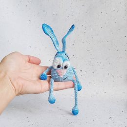 Эта очаровательная зайка с голубым бантиком и изысканным нарядом просто завораживает. Каждая деталь, от аккуратного вязания до милого выражения, придает ей уник...