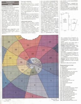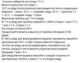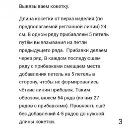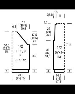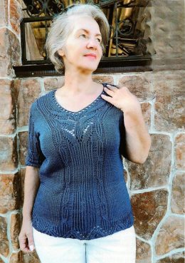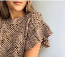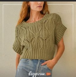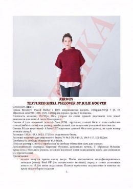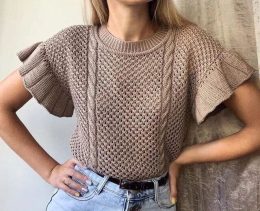 Изделие выполнено спицами с использованием ажурной сетчатой вязки, что придаёт ткани лёгкость и воздушность. Особенность модели — широкие рюши на коротких рукав...