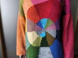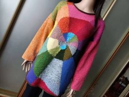Этот свитер привлекает внимание яркой спиралью из разноцветных сегментов, создающей динамичный и художественный эффект. Вязаное полотно отличается сочетанием те...