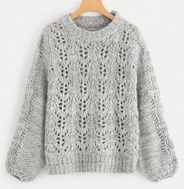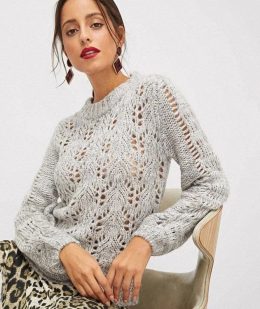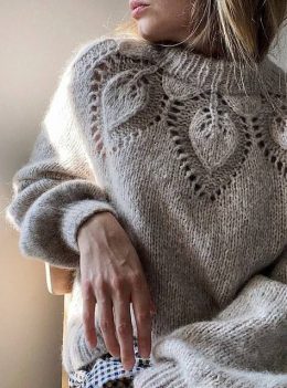 Мягкий серый свитер выполнен из объемной пряжи с выразительным ажурным узором в виде листьев, создающим эффект легкой прозрачности. Модель отличается плотным ре...